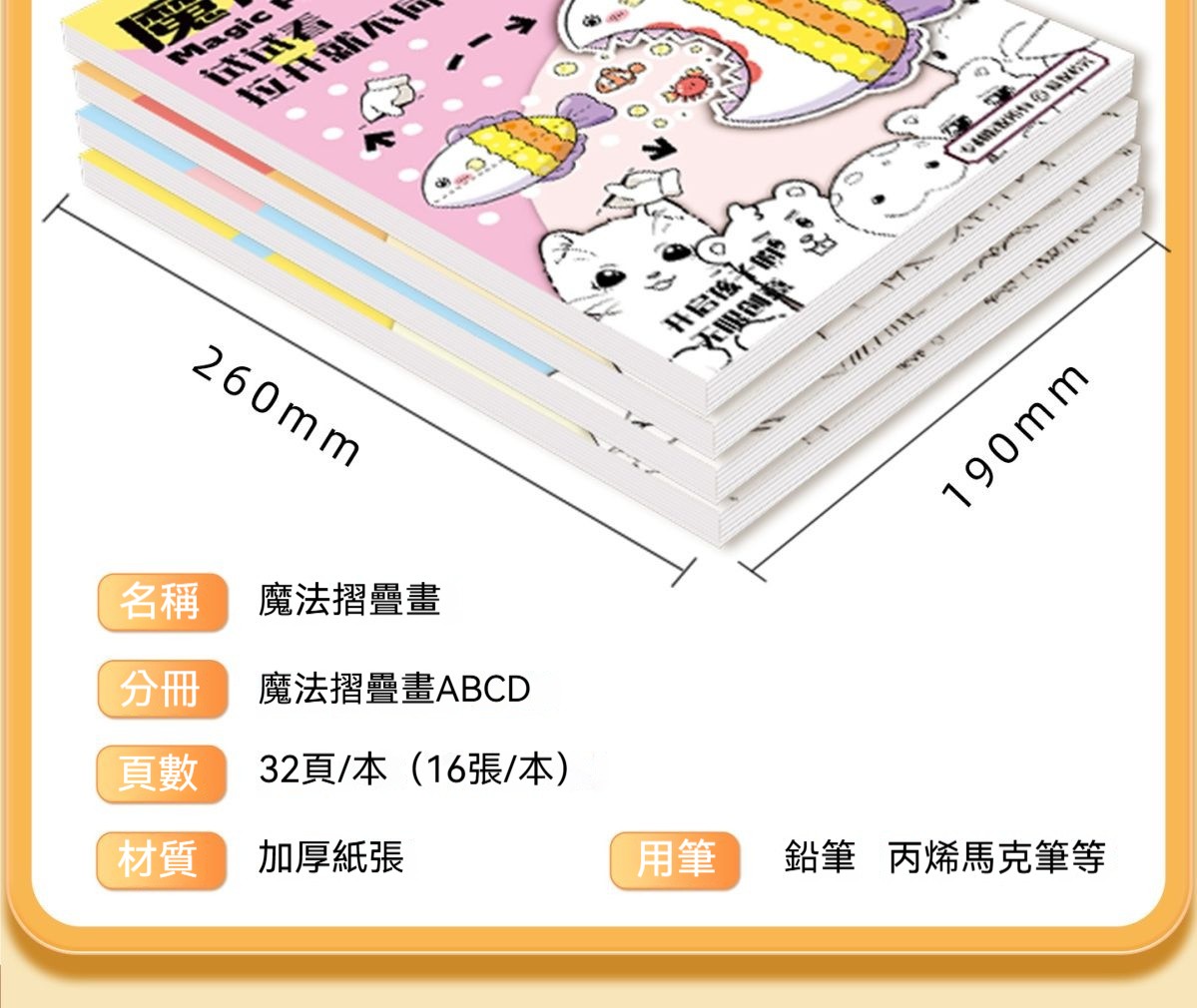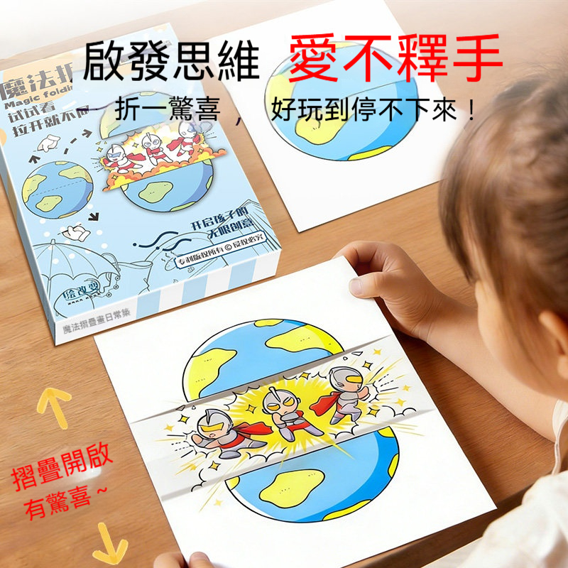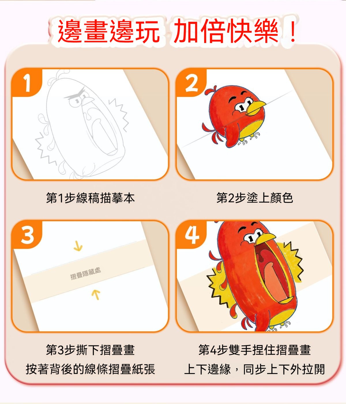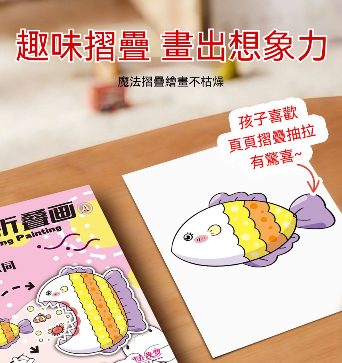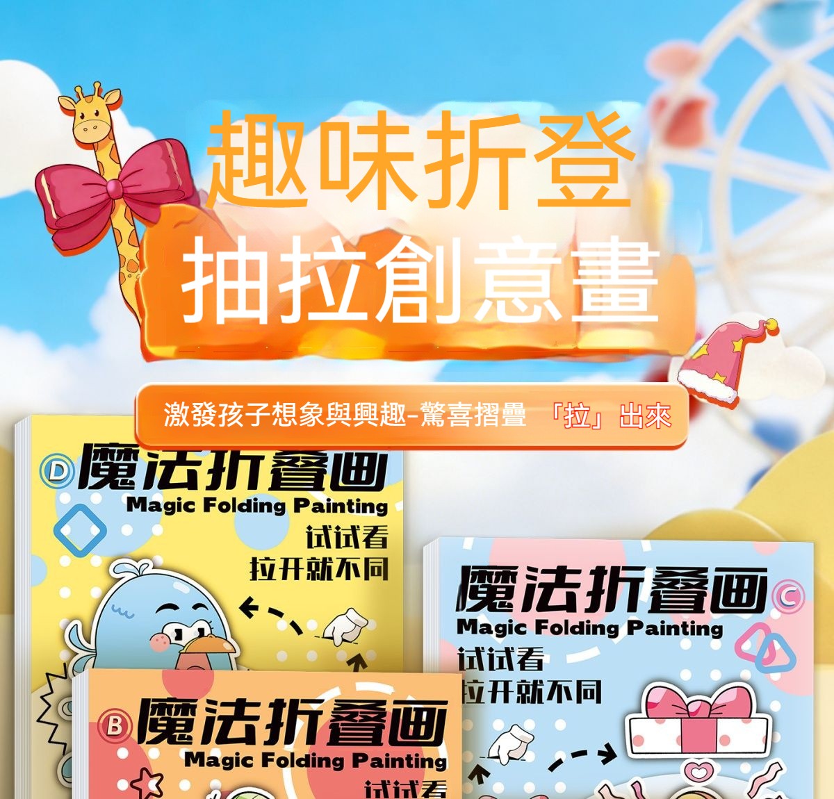 【魔法折疊繪畫本】以 隱藏式折頁設計+淺色描摹線,✨ 一拉展開驚喜畫面,讓創作變得超好玩!讓靜態塗鴉變成會「長大」、「變身」的動態故事,激發無窮想像力!✨